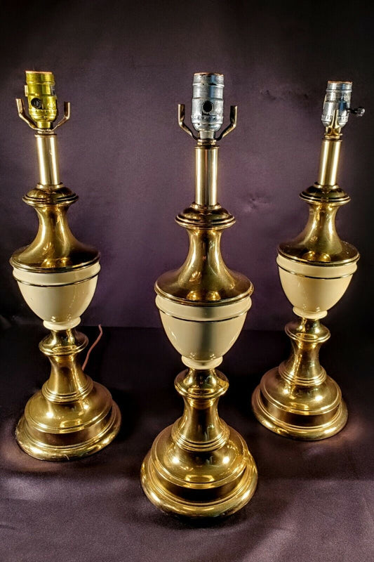 Set of 3 Vintage Stiffel Brass and Cream Porcelain Fine Table Lamps