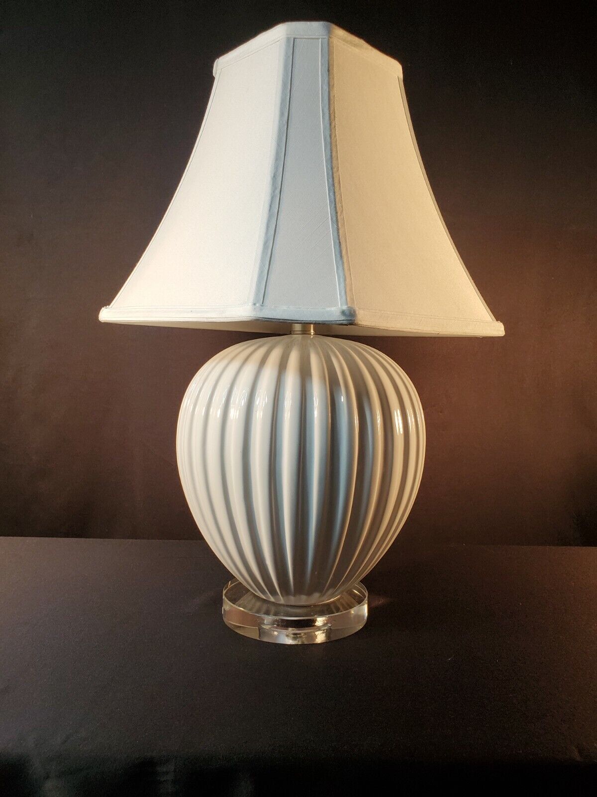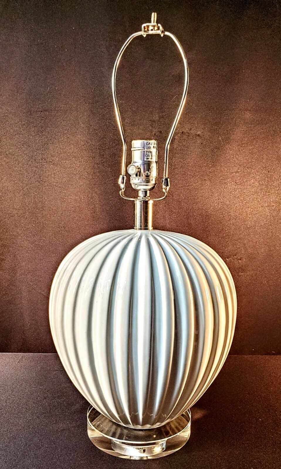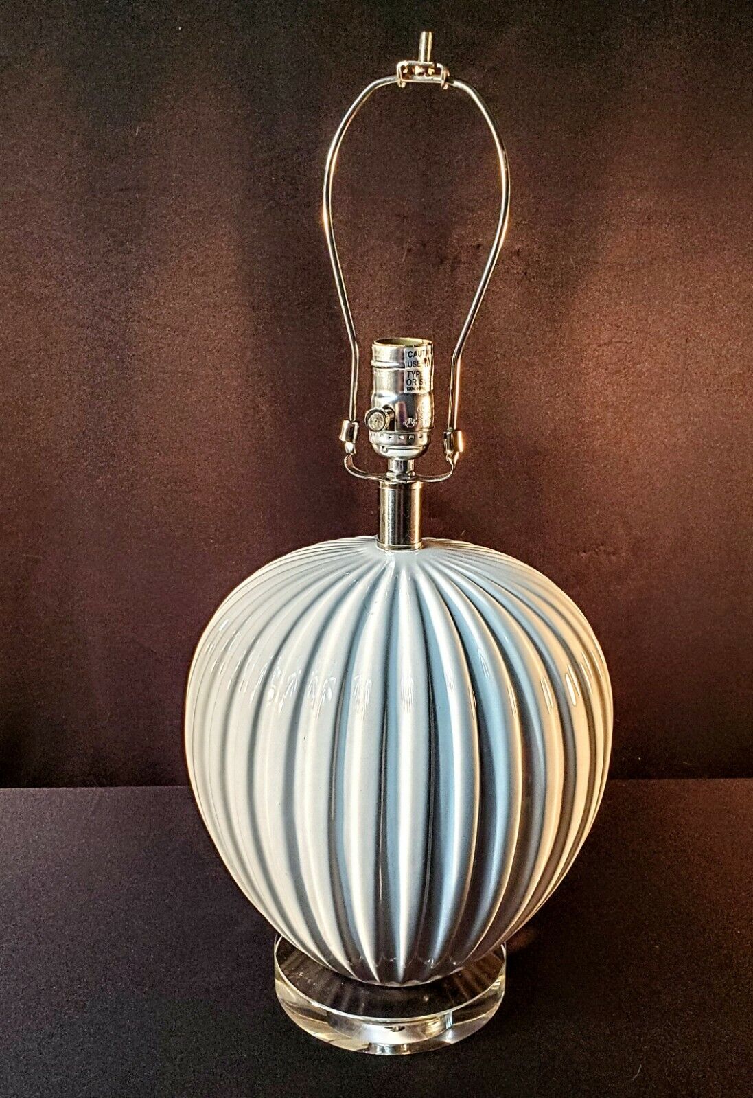 This listing is for a Fredrick Cooper Round Ribbed Semi Urn Style White Heavy Porcelain Table Lamp. This lamp features a 31 inch circumference of deep valleys and Hugh ridges that give this lamp a dynamic, unique three dimensional quality. Standing 17 inches to socket, 23 inches to its final with a flush 5 7/8 inch by one inch tall clear circular Lucite base. This amazing example of Fredrick Cooper Chicago's finest design and quality of its Porcelain composition make this lamp a piece that makes a statement in any room.