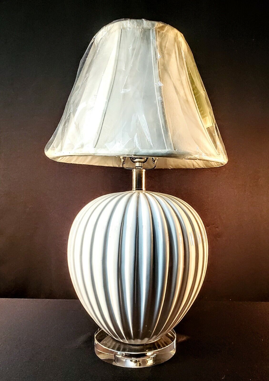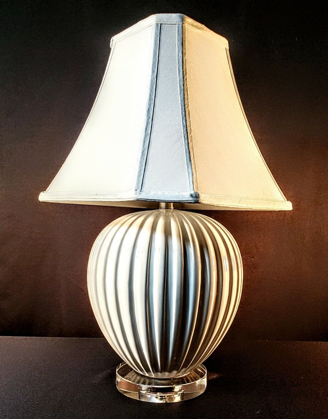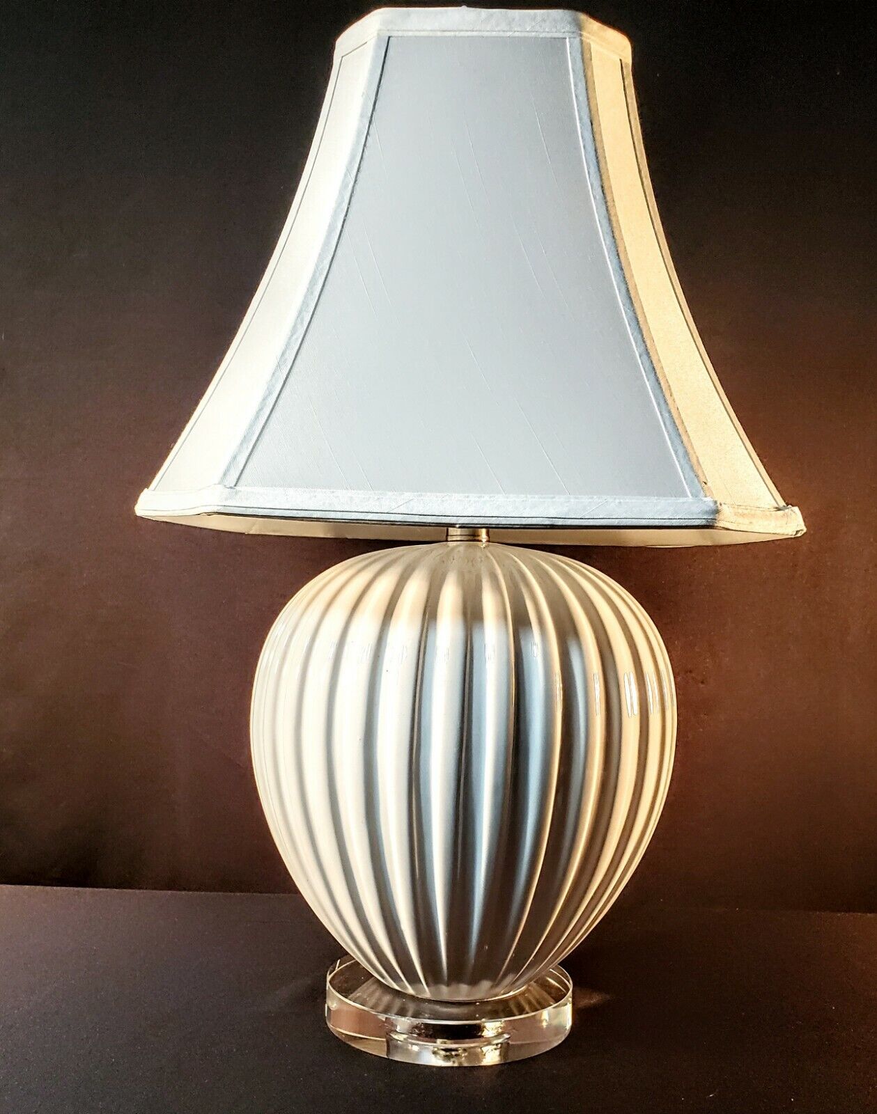 This listing is for a Fredrick Cooper Round Ribbed Semi Urn Style White Heavy Porcelain Table Lamp. This lamp features a 31 inch circumference of deep valleys and Hugh ridges that give this lamp a dynamic, unique three dimensional quality. Standing 17 inches to socket, 23 inches to its final with a flush 5 7/8 inch by one inch tall clear circular Lucite base. This amazing example of Fredrick Cooper Chicago's finest design and quality of its Porcelain composition make this lamp a piece that makes a statement in any room.