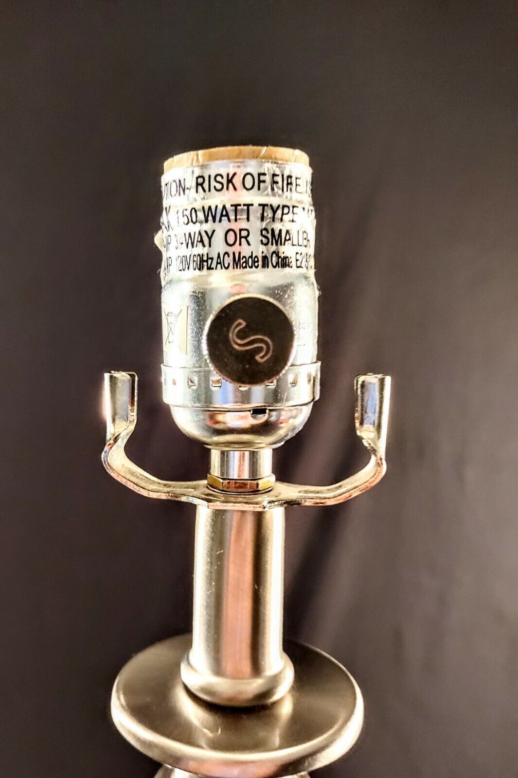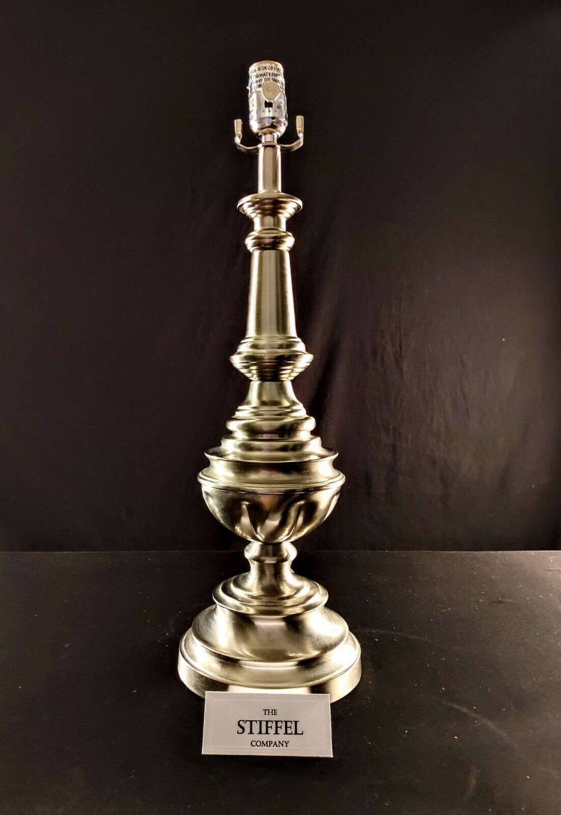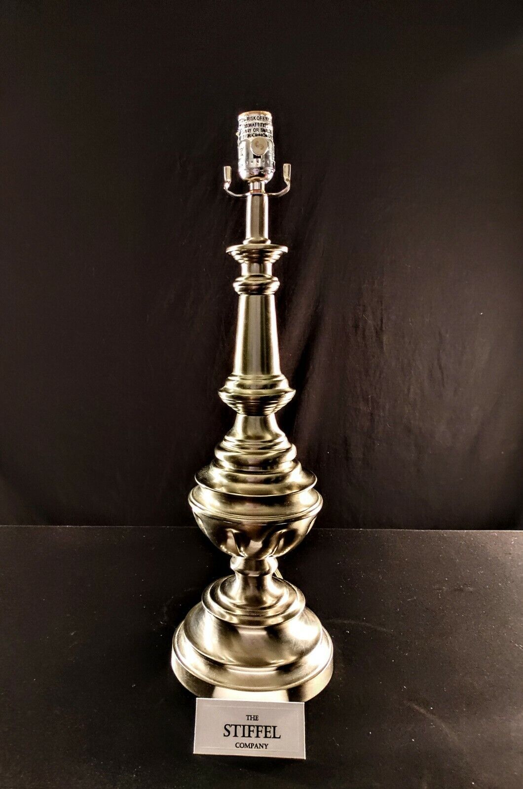 This listing is for a rare medium sized Genuine Stiffel Fine Brushed Aluminum Table Lamp. This lamp features modern example of Stiffel's more current pieces. This piece stands a full 31 5/8 inches to it's matching final, a full 22 1/4 inches to it's socket and features a 7 inch circular, flush mounting, multi-tiered solid aluminum base.