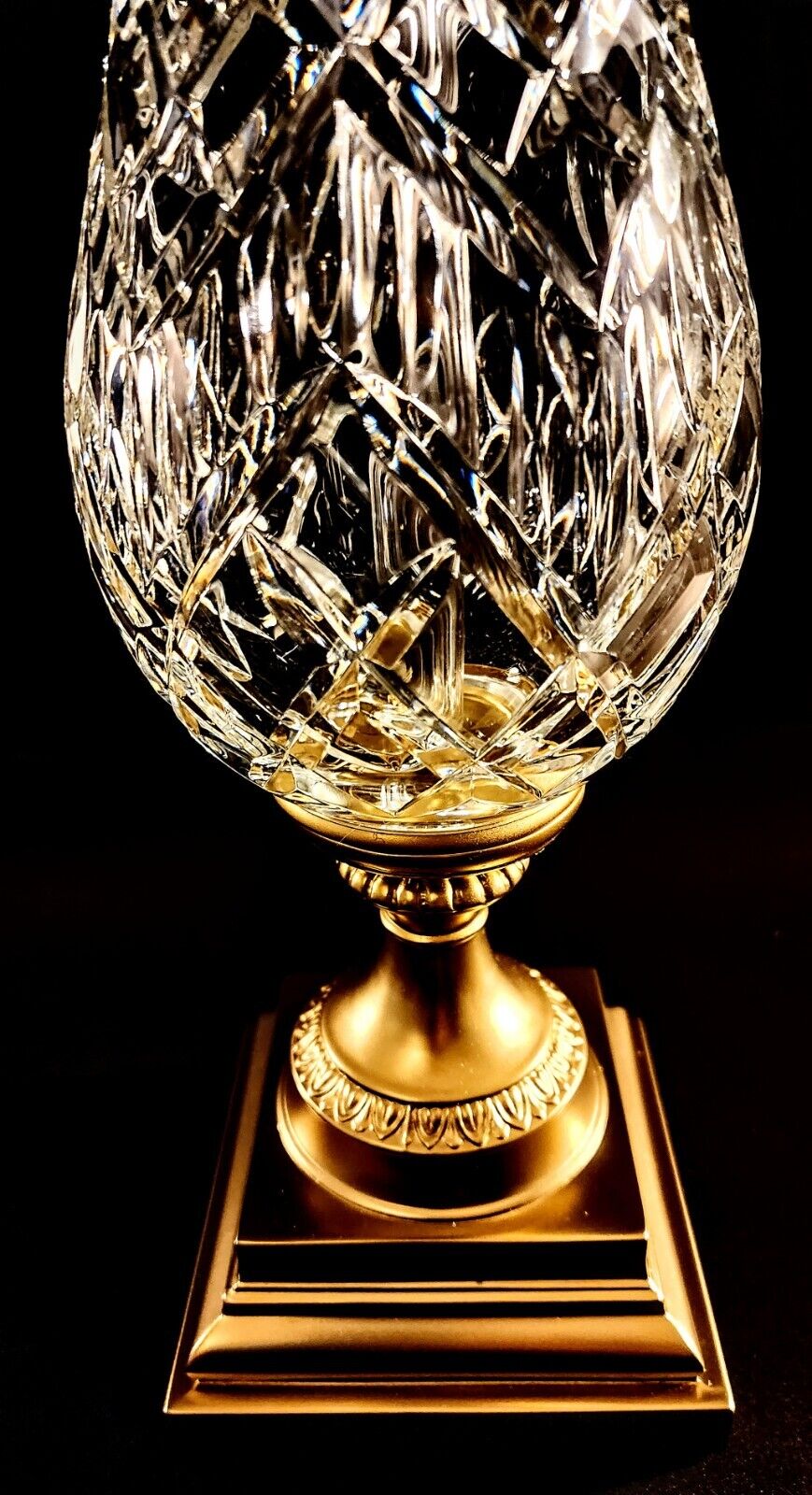 This lamp is 34 3/8 inches tall. It's topped with their original solid brass, highly polished Waterford final. The lamp's genuine Waterford highly polished brass sockets and dials stand a full 24 1/2 inches high. The base is a 6 inch by 6 inch square, stepped, multi-tiered, brass base. The beautiful solid hand-cut crystal stands a full 12 1/2 inches tall, 6 inches wide, and has a massive 17-inch circumference.